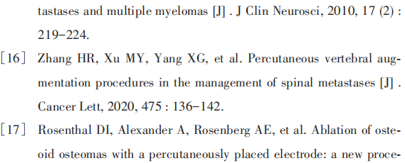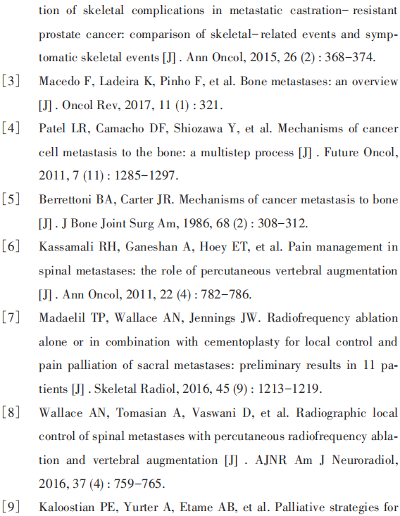 有很多研究已经证实RFA的镇痛作用,Goetz等[18]报道43例骨转移性疼痛患者中41例在6个月后接受RFA治疗后疼痛明显减轻。关于疼痛减轻的主要机制获得较多认可的是:通过破坏骨内感觉神经纤维,抑制疼痛传导,并可以抑制破骨细胞活性[19]。Rosian[20]通过总结了9项研究论文(包括4项前瞻性研究和5项回顾性研究,共583例脊柱转移性肿瘤患者接受RFA治疗),证实RFA治疗脊柱转移性肿瘤的可行性,特别是那些对传统疗法有禁忌,存在转移性椎体疼痛及有肿瘤进展危险的患者。