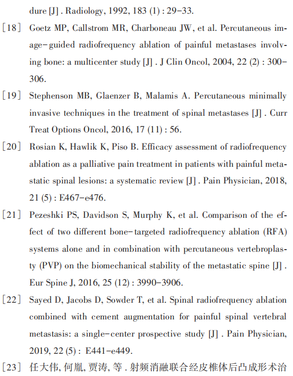 国内外许多研究将 PVP/PKP与RFA两种技术结合到了一起。RFA使得肿瘤组织被破坏,肿瘤体积减少,骨水泥分布更加均匀,同时阻断血液供应,减少了骨水泥渗漏的风险,PVP/PKP能够起到弥补RFA无法恢复椎体形 态及预防病理性骨折的作用[21]。Sayed[22]将两种治疗方式相结合发现患者术后1周、1个月和3个月疼痛明显减轻,任大伟[23]将RFA与 PKP联合治疗18例脊柱转移性肿瘤患者术后24 h内疼痛明显缓解,并且术后3个月,9例患者疼痛完全缓解,7例患者术后止痛药用量减少或止痛药级别降低,治疗后的VAS、JOA、RMDQ评分及体前缘高度均较治疗前显著改善。