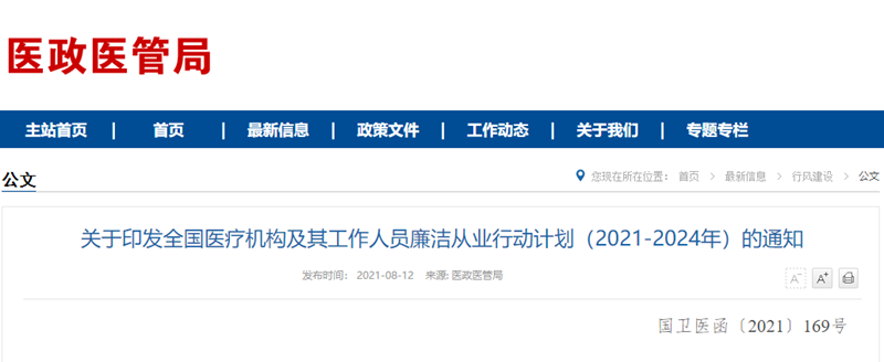 查看《全国医疗机构及其工作人员廉洁从业行动计划(2021-2024年)》原文请到医政医管局官网查看
