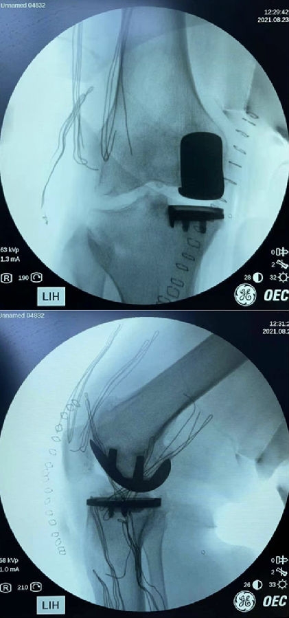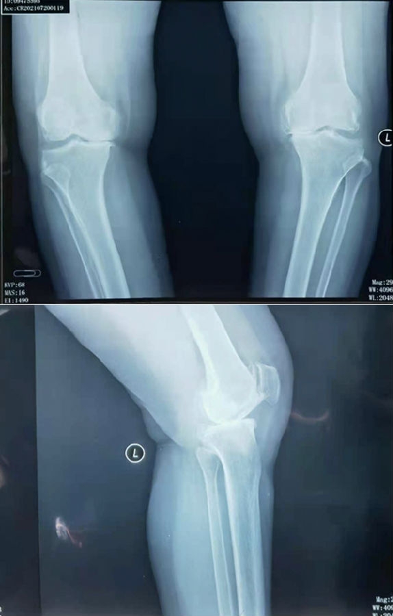 患者女,65岁,通过负重正侧位片,诊断:前内侧骨关节炎,符合单髁置换指征。术中发现外侧小片软骨剥脱。但是,术前屈曲二十度外翻应力位,外侧关节间隙完好,仍按计划行单髁置换术。