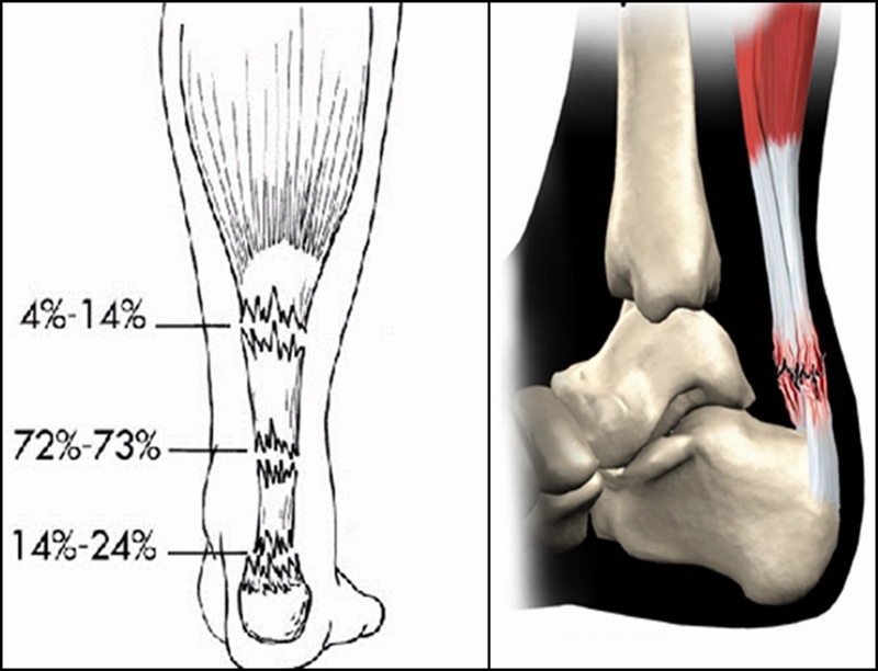 跟腱长期慢性牵拉劳损,产生跟腱炎、腱周炎,跟腱组织变脆,影响跟腱血供。