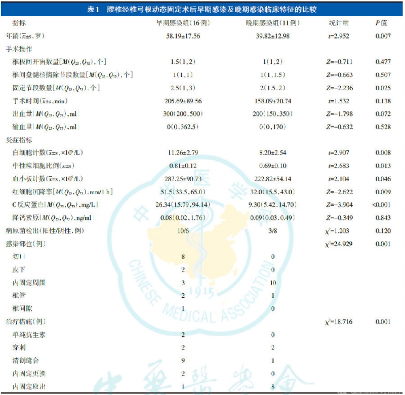 采用SPSS 19.0统计软件包(SPSS,美国)进行统计分析。计量资料中患者年龄、手术时间、白细胞计数、中性粒细胞比例、血小板计数经检验符合正态分布,以均数±标准差表示,早期感染组与晚期感染组的组间比较采用成组设计资料t检验;椎板间开窗数量、椎间盘髓核摘除节段数量、固定节段数量、术中出血量、输血量、红细胞沉降率、C反应蛋白、降钙素原不符合正态分布,以中位数和四分位数间距[M(Q25,Q75)]表示,组间比较采用Mann⁃Whitney检验。主要感染部位、主要治疗措施为计数资料,组间比较采用卡方检验或Fisher 精确检验。检验水准α值取双侧0.05。
