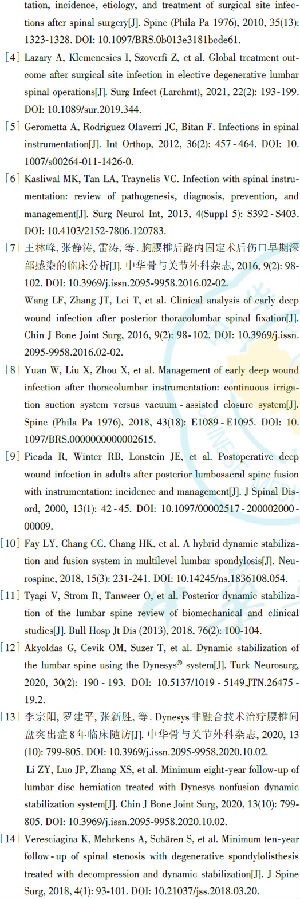 腰椎退行性疾病主要包括腰椎间盘突出症、腰椎滑脱症、腰椎管狭窄症等,在特定的适应证下手术干预可以达到椎管减压和椎间稳定的目的。其中腰椎融合手术是治疗腰椎退行性疾病的经典术式,但手术可导致腰椎固定节段活动度的丧失。因此,既能保持腰椎稳定、又能保留固定节段活动度的腰椎非融合手术在近20年来得到了迅速的发展[10-11]。其中以Dynesys为代表的腰椎后路经椎弓根动态稳定系统应用最为广泛[12-14]。Welch等[15]和Grob等[16]报告Dynesys内固定术后的感染率为0.9%和3.2%。目前经椎弓根动态稳定系统的研究以单中心、小样本的病例对照研究为主,主要探讨临床疗效、影像学变化和并发症情况,尚无术后感染管理方面的文献报道。