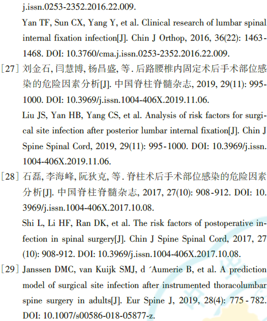 术后感染可发生于切口或深筋膜以下、椎管、椎间隙、椎旁以及内固定周围[17-19]。