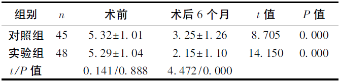 术前,两组疼痛程度差异不显著(P>0.05);术后6个月,两组VAS评分均有所下降,且实验组明显低于对照组(均P<0.001)。见表3。