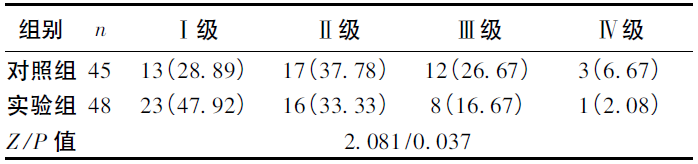 实验组治疗效果明显优于对照组(P<0.05) 。见表2。