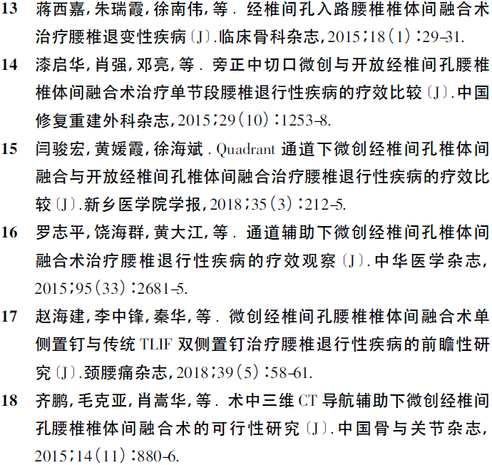 目前临床对于经保守治疗无效患者,常采用外科手术治疗,研究显示,经椎间孔腰椎椎体间融合术(TLIF)可获得较好神经减压及节段固定融合,可取得一定效果。传统TLIF一直以来被用于腰椎退行性疾病,但其具有一定局限性,如创伤大,术中出血量多,术后恢复慢等,不利于预后[2]。