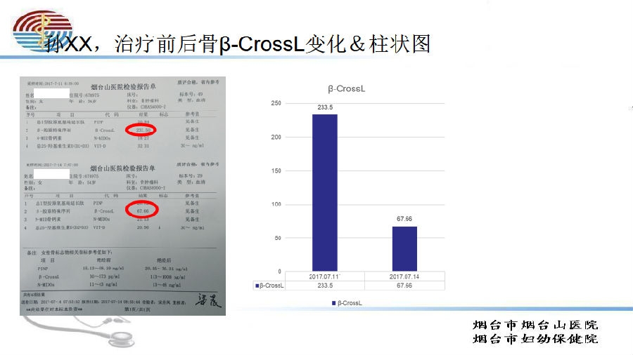 这是初诊患者,拟收住院治疗,启动9999元套餐。常规入院检查,骨密度和骨代谢指标,胸腰椎MRI检查,胸部CT,化验骨髓瘤和甲旁亢、肿瘤化验指标。确诊骨质疏松症,排除肿瘤等继发因素。用四套方案中的第一套,钙剂加维生素D,加唑来膦酸(5mg)。同时给予磁振热和骨质疏松治疗仪治疗。治疗前后对比,治疗前疼痛VAS评分8分,治疗后疼痛VAS评分3分,疼痛明显缓解。治疗前CTX是1038pg/ml,治疗后CTX是108pg/ml,出现断崖式下降。和患者沟通:①疼痛症状减轻,VAS评分明显下降;②骨代谢指标CTX代表破骨细胞功能指标,其出现明显下降,说明应用唑来膦酸取得明显效果;③唑来膦酸要连续应用3年。用客观指标和患者交流,患者对治疗非常满意,显著提高患者依从性。本患者也确实完成了唑来膦酸3年的连续治疗。