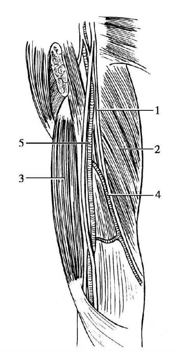 图1 上臂段尺神经解剖 1.尺神经;2.肱三头肌;3.肱二头肌;4.尺侧上副动脉;5.肱动脉