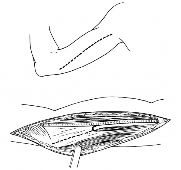 尺神经于肱动脉后方,在上臂中段转入肱三头肌内侧头筋膜内,伸延至肘关节后的尺神经沟,在虚线上切开,即可显露出尺神经。