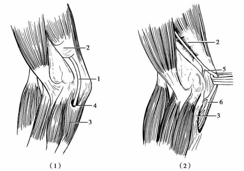 图2 肘管的解剖 (1)1.尺神经从2.肱三头肌内侧头筋膜穿出,进入肘关节后的尺神经沟,又从3.尺侧腕屈肌两头4.之间,穿入前臂;(2)牵起尺神经,可见5.关节支,切开2.肱三头肌内侧头及3.尺侧腕屈肌两头间的筋膜可见6.尺侧腕屈肌肌支