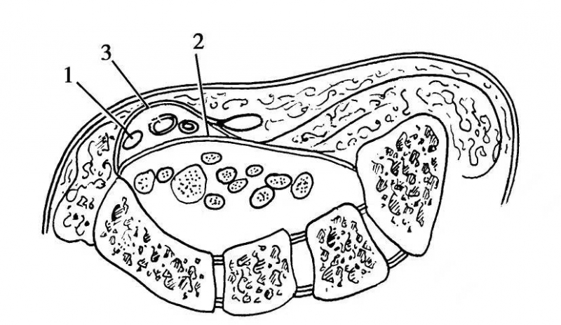 图3 尺神经在腕管Guyon管内的解剖 1.尺神经及2.尺动、静脉在腕横韧带之浅面经过,其顶部3.为腕掌侧韧带,是尺侧腕屈肌附在豌豆骨后的延伸部分