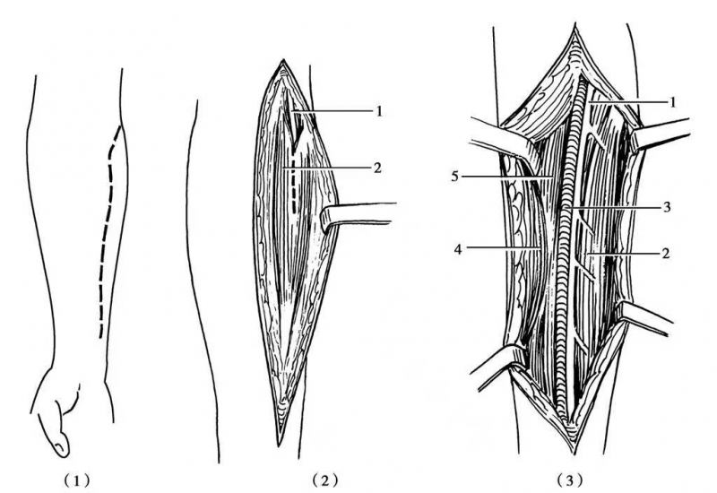 图6 前臂尺神经切口及显露 (1)切口;(2)上段尺神经1.在尺侧腕屈肌2.尺侧;(3)下段尺神经1.在尺侧腕屈肌2.桡侧,经过指浅屈肌的尺侧4.其深面为指深屈肌5,3.为尺动脉