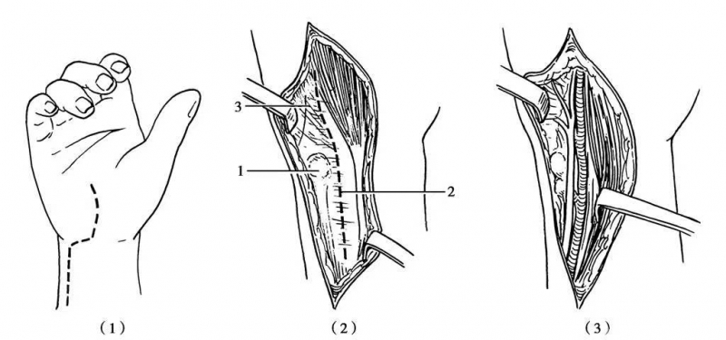 图7 腕掌部尺神经的切口与显露 (1)切口;(2)在1.豌豆骨与尺侧腕屈肌的桡侧方切开2.腕掌侧韧带(虚线)即能显露尺神经。在3.钩突桡侧切开掌筋膜即能显露尺神经远侧部分;(3)尺神经及尺动脉已显露出来