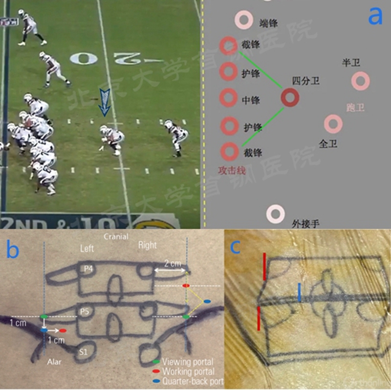 图1 a.美式橄榄球运动中四分卫的位置(图片来源于网络);b.Choi文中报道的Quarterback切口位置示意图(图片来源于文献);c.Kang文中报道的Quarterback切口的皮肤投影位置(图片来源于文献)