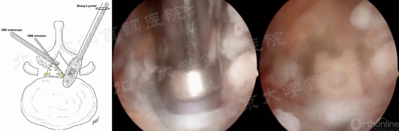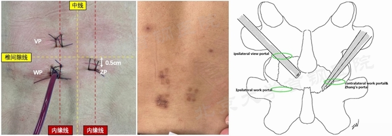 图8 我中心在腰椎UBE-ULBD中应用Zhang切口对对侧Corner进行减压(图片来源我中心,引用转发需注明出处)和腰椎Zhang切口应用示意图(张伟教授提供)