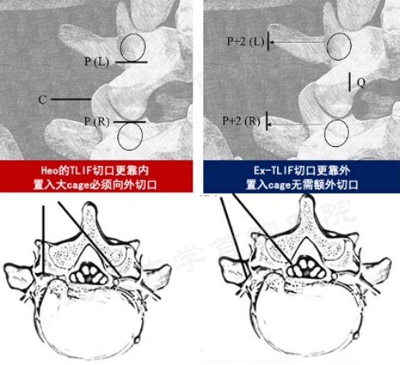 图10 改良远外侧TLIF切口与Ex-TLIF切口对比以及增加切口的原因(图片为对文献中图片进行的加工)