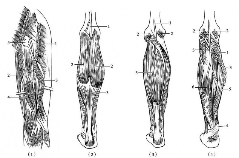 图1 胫神经的解剖(1)2.胫神经在大腿段属1.坐骨神经一部分,位于其前内侧,有分支分出支配3.股二头肌长头4.半腱肌半膜肌,三块肌都起于5.坐骨结节;(2)小腿段1.胫神经在2.腓肠肌与3.比目鱼肌和深层屈趾肌之间下行;(3)切去腓肠肌后可见胫神经仍在蹠肌和比目鱼肌深面;(4)切去比目鱼肌后才显出1.胫神经,在5.趾长屈肌与6.踇长屈肌之间下行。最后转入内踝的蹠管,通入足底,蹠管表面有4.屈肌支持带
