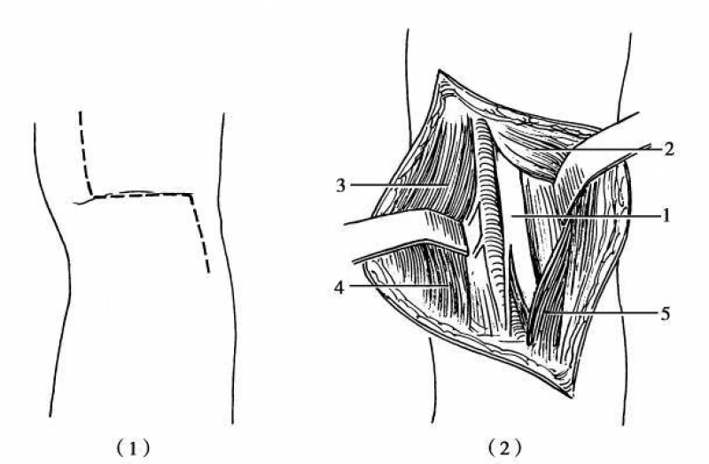 探查腓总神经时,患者采取半侧俯卧位,患肢在上,在腘窝和腓骨小头附近,作膝部后外侧切口。切口由大腿中下后侧中线开始,向下外方沿股二头肌内侧切开,在腘横纹处稍作弧形横行,然后到达股二头肌腱内侧下行,斜向腓骨小头下,绕过腓骨颈到达小腿前方(图5)。