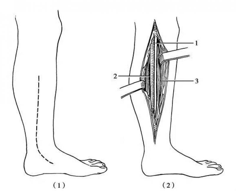 腘动、静脉位于神经深面,从神经发出的肌支应小心保护。由于胫神经进入比目鱼肌腱弓的深面后,慢慢转向小腿内侧,故显露小腿中段及下段胫神经要采取小腿内侧切口。即从小腿内侧中部腓肠肌内侧缘开始,在跟腱和内踝中点的连线上。
