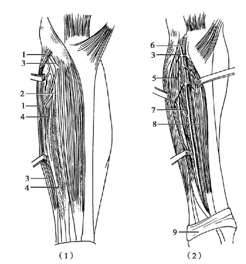 图4 腓总神经的解剖(1)腓总神经从腘窝伸向腓侧,绕过腓骨颈部,转到小腿前外侧,穿过1.腓骨长肌分为2.腓浅神经与3.腓深神经。腓浅神经支配腓骨长肌及4.腓骨短肌;(2)腓深神经穿过腓骨长肌和5.趾长伸肌沿骨间膜前方与6.胫前动脉下行,到7.[插图]长伸肌与8.胫前肌之间,穿过踝关节前方的9.伸肌支持带进入足背
