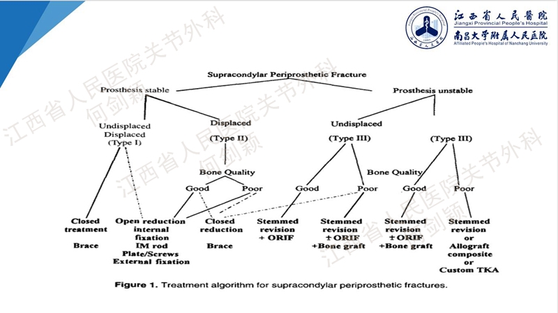 根据文献,股骨假体周围骨折分型常使用Rorabeck分型,Ⅰ型是骨折无移位,假体稳定;Ⅱ型是骨折有移位,但假体稳定;Ⅲ型是骨折累积的髁间假体不稳定,髁间假体之间存在松动。