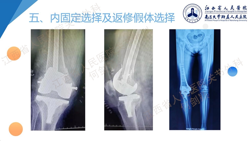 也有使用髁间股骨远端髓内钉联合锁定钢板的方案,也可以使用NexGen髁限制性假体。使用NexGen假体,前提是假体松动,必须先使用克氏针或是临时固定,方便给予植入髓内固定延长,置入后经过植骨或交叉稳定或骨水泥技术,方便长入。