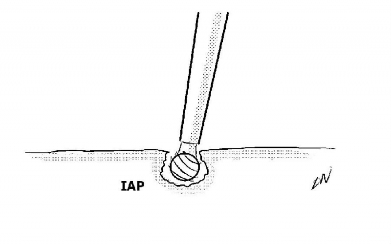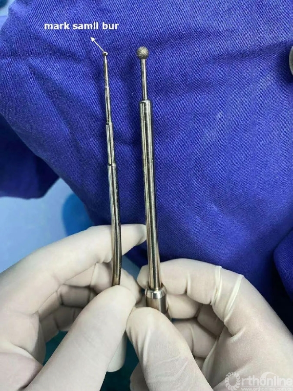 内镜监视下使用mark小磨钻进行第一定位,发现定位线过于偏内。