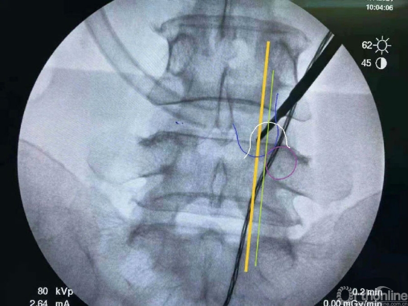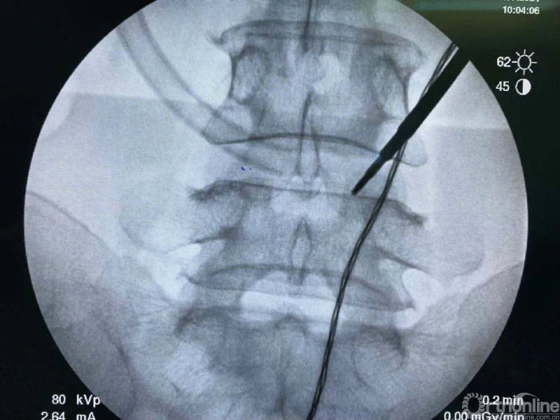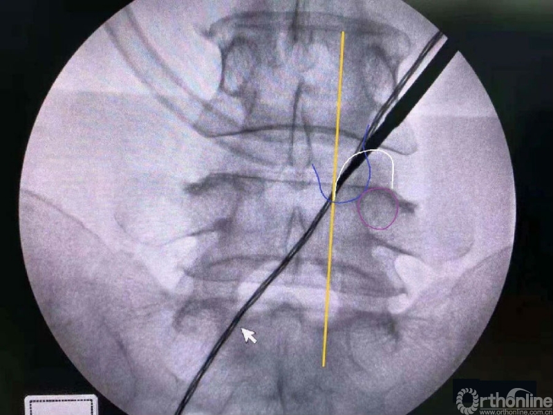 术前克氏针确定内镜口位置位于椎板稍微偏远,是一个比较理想的定位。