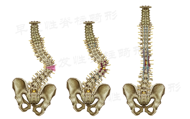 对于累及范围短的畸形,可通过骨骺阻滞、截骨短节段融合等手术来治疗,短节段融合对患儿脊柱以及胸廓生长的影响很小。对于累及范围长的畸形来说,早期融合会导致短躯干以及胸廓发育不良综合征,因此对于此类患者,应当使用非融合技术。