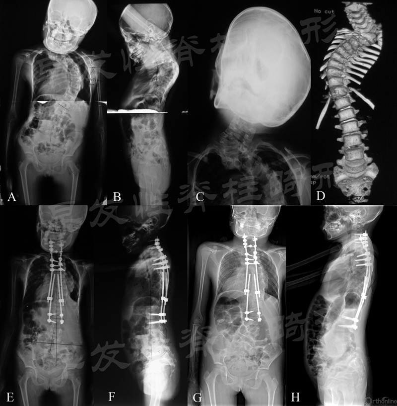图4 患儿,女性,8岁。A~D.复杂颈胸段畸形伴胸椎严重侧凸;E、F.行颈胸段截骨短节段融合,远端使用双生长棒控制胸弯;G、H.术后3年提示矫形维持良好