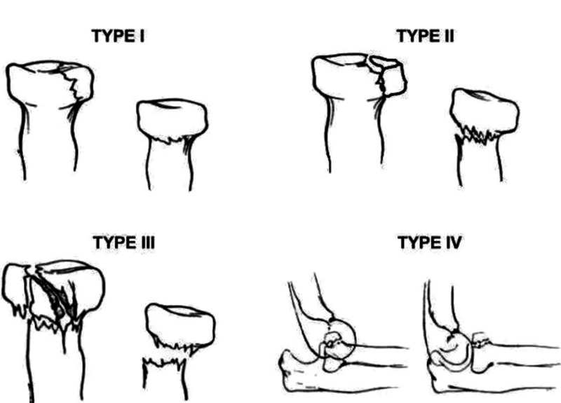 依据桡骨头赤道线分型,大部分关节内的桡骨头骨折(Mason2型),都会累及桡骨头的前外1/4。分为:
