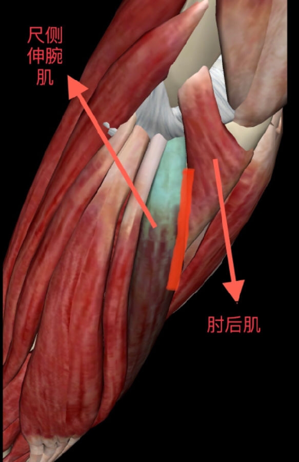 起自肱骨外上髁后侧,沿伸肌群后缘向远侧延长4~5cm至尺骨上端外侧缘。(斜向尺骨后侧,止于鹰嘴尖下方6cm处)。自尺侧伸腕肌与肘肌间隙分离。肘肌向尺侧,尺侧伸腕肌向桡侧牵开。