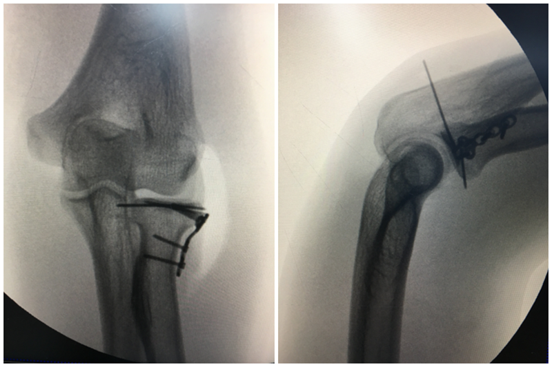 ①1.0mm克针或2.7mm螺钉固定,骨折复位巾钳固定,保持骨折块血运,关节面解剖复位,内固定。应旋后位,克针从骨折块前半部打入;然后旋前位,克针从骨折块后半部打入。用手动埋头器磨出埋头孔。再拧入螺钉。与骨折面垂直固定,经桡骨头非关节面穿钉。