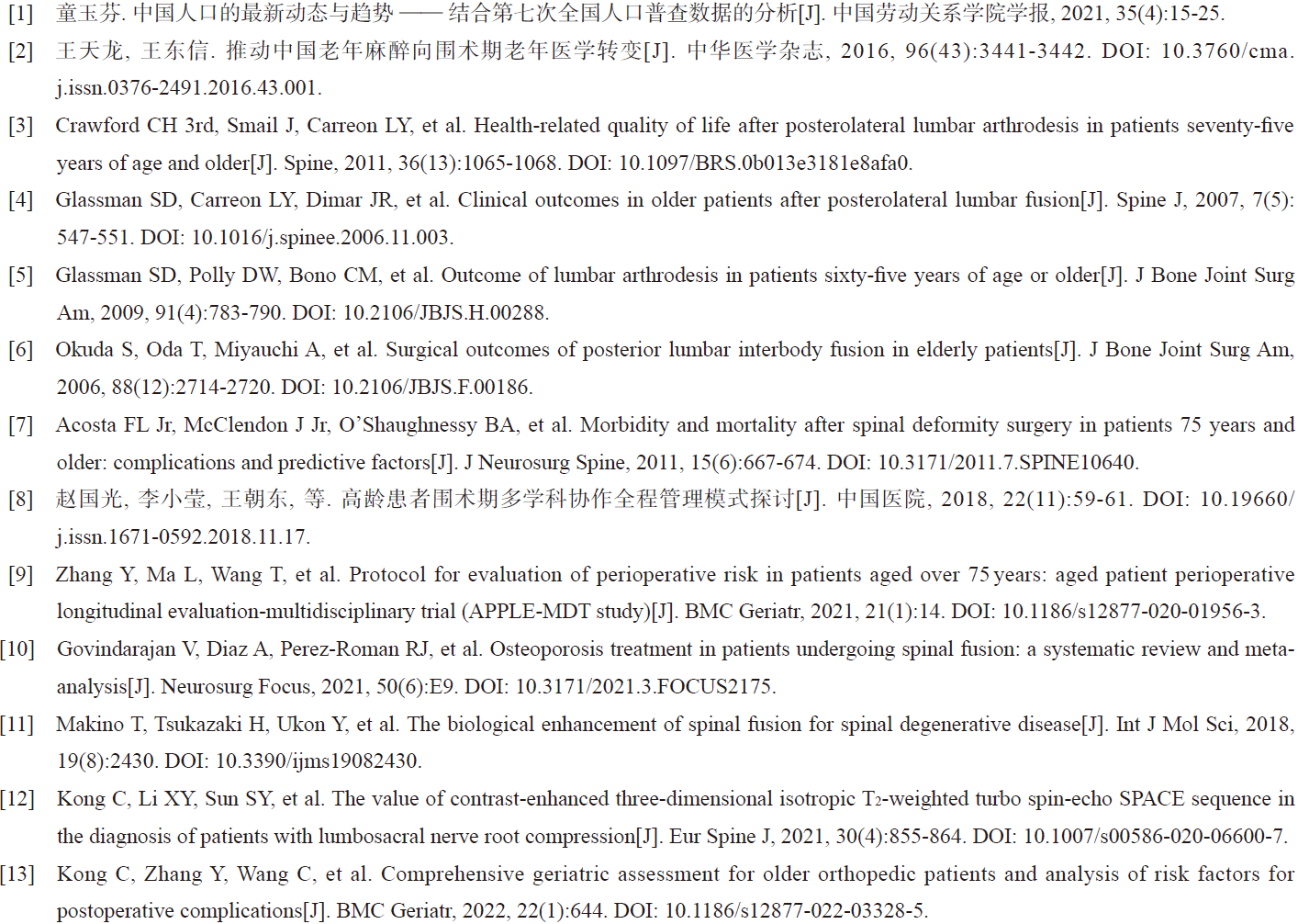 高龄患者有衰弱、多病共存、多重用药、器官功能衰竭等问题,而脊柱手术相对时间长、创伤大、风险高,两者叠加导致高龄脊柱患者的可手术率低,围术期并发症发生风险高,术后康复进程缓慢,这也是高龄脊柱手术难以在国内开展的主要原因[2]。不过随着医疗技术水平的日益成熟,年龄已不再是老人手术的绝对禁忌。