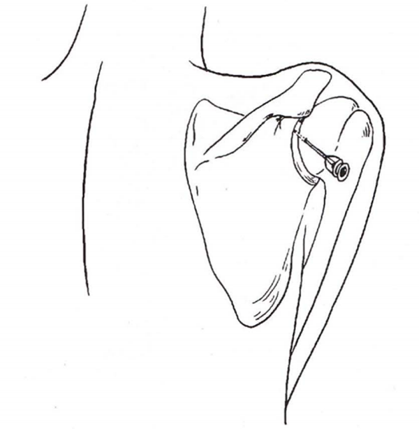 ②后侧入路:将患者上肢内旋内收,交叉过胸前,手部搭于对侧肩部,触及肩峰后外侧角,在其下方2cm、内侧1cm,朝向喙突尖端刺入(图2)。