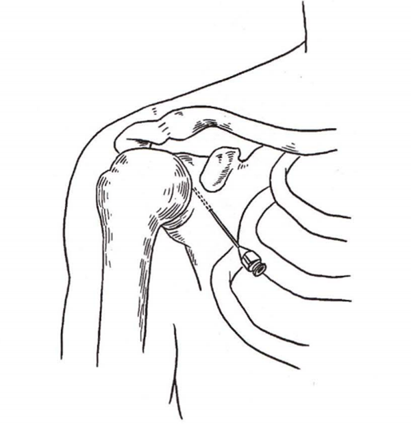 ①前侧入路:将患者肩关节轻度外展外旋,肘关节屈曲90°;体表定位最重要的解剖标志是喙突,在触及喙突尖端后,在外侧于肱骨小结节和喙突连线中点垂直刺入;或者从喙突尖端向下找到三角肌前缘,向后外方刺入(图1)。