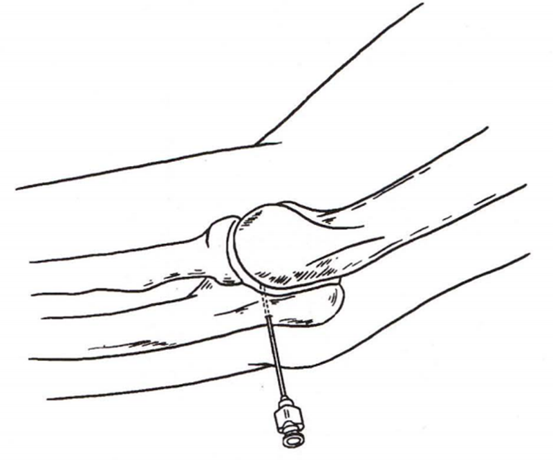 施行肘关节穿刺术,患者一般采用坐位。穿刺入路可以选择后外侧入路和鹰嘴上入路。