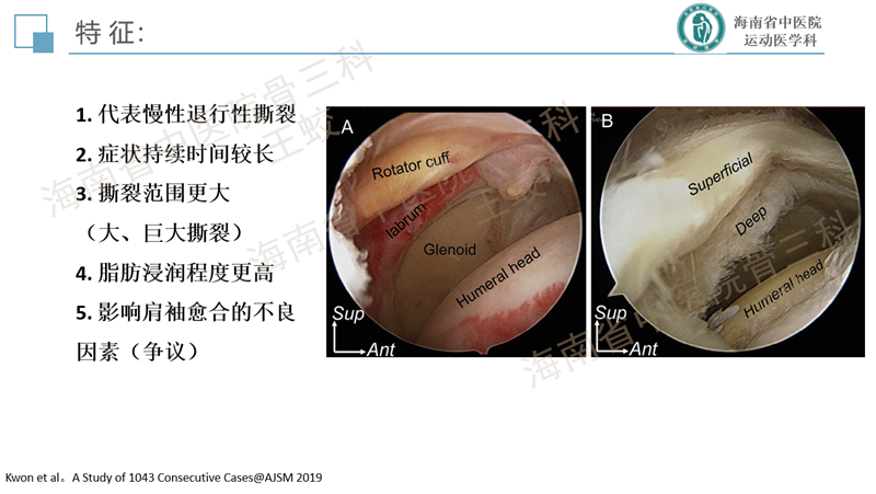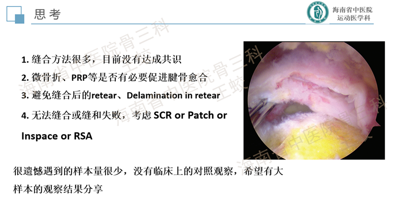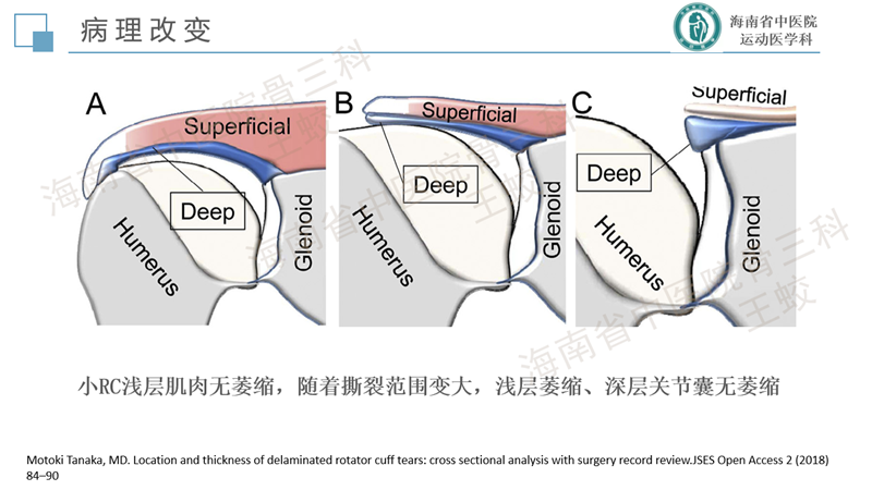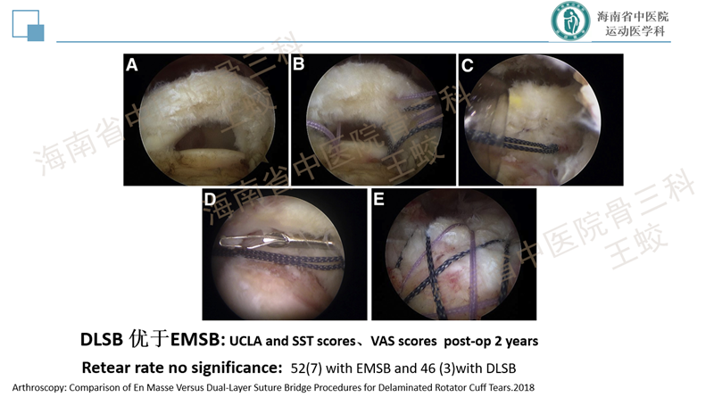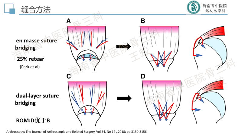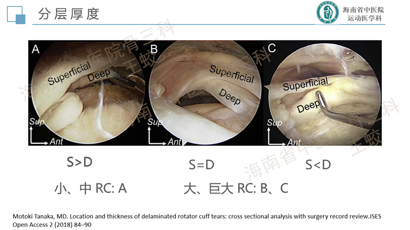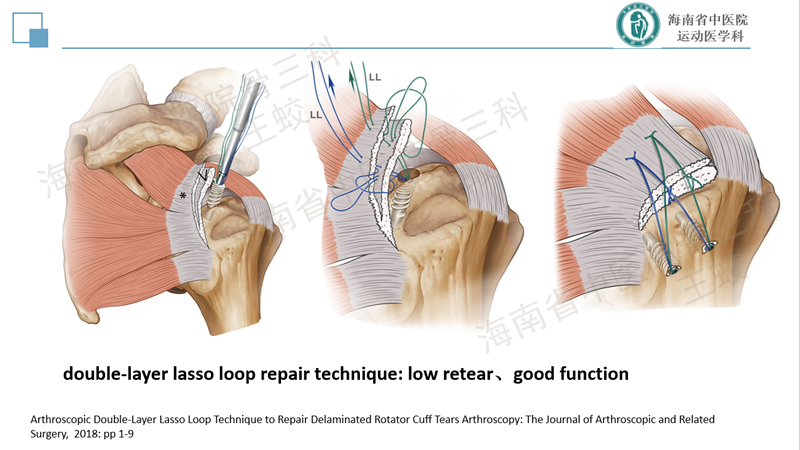 肩袖分层撕裂是肩袖的一种慢性退变性疾病,类似于膝关节内侧半月板后角的退变性层裂,患者往往肩痛症状较重,持续时间较长,预后较差。目前发病机制尚不十分明确,研究较少。缝合方法也没有达成共识,恢复肩袖的完整性,保持层间的张力是临床上需要重点关注的问题。