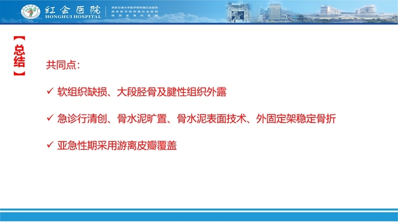 6. 软组织缺损的胫骨骨外露,覆盖方法多样,因伤、因人、因地、因经济,遵循各种方法原则的前提下采取最合适方法去处理,包括截肢;