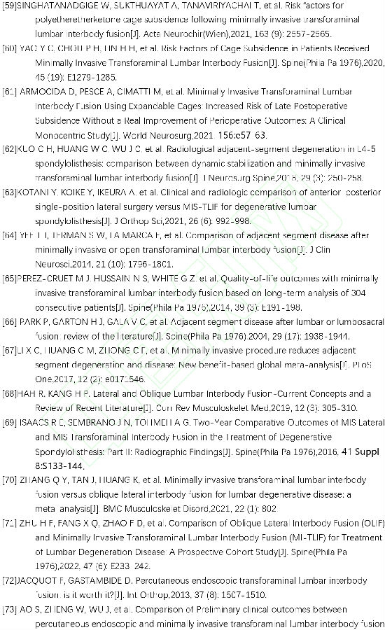 邻近节段退变和邻近节段疾病是脊柱融合手术常见的并发症,前者是影像学改变而不伴随症状出现,后者则伴随神经根、脊髓病变或脊柱不稳等相关症状。MIS-TLIF患者术后邻近节段退变发生率为3%~37%[47, 62-63],而邻近节段疾病发生率为1.3%~8.0%[64-65]。