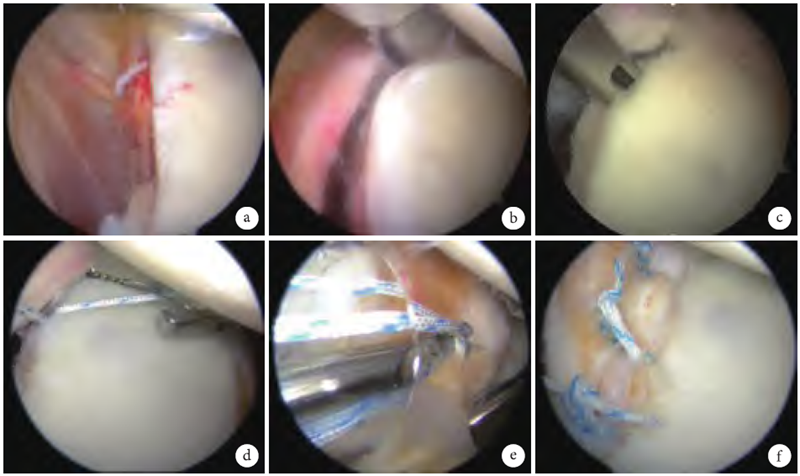 镜下清理肩关节腔内增生滑膜,铲刀沿关节盂边缘从2∶00向6∶30方向松解粘连的关节囊盂唇复合体。射频切除盂唇边缘3mm左右软骨,新鲜化切除软骨后的关节盂骨床边缘及关节盂内侧壁。视术中所见撕裂大小,从5∶30向2∶30方向植入3~4枚单/双线缝合锚钉,上提紧缩缝合固定关节囊盂唇复合体,依次打结后剪除缝线尾端。检查关节囊盂唇复合体修复满意后,再次冲洗清理关节腔,射频止血,缝合切口。见图1。其中,2例术中发现合并软骨游离体,行游离体取出。