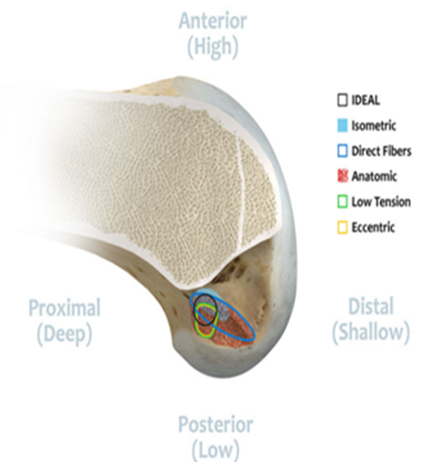 I.D.E.A.L. femoral tunnel location (黑色圆圈位置为理想股骨骨道位置)。