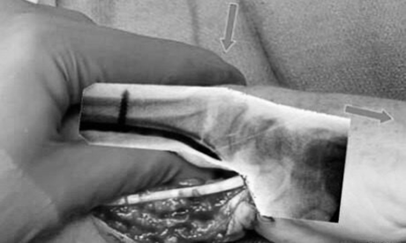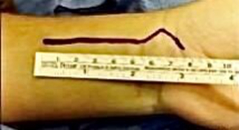 C、显露要充分,切口要尽量靠近远端,超过腕横纹;我们的经验是切口经过腕横纹时,增加一个锯齿切口,以防止腕部形成索状疤痕。