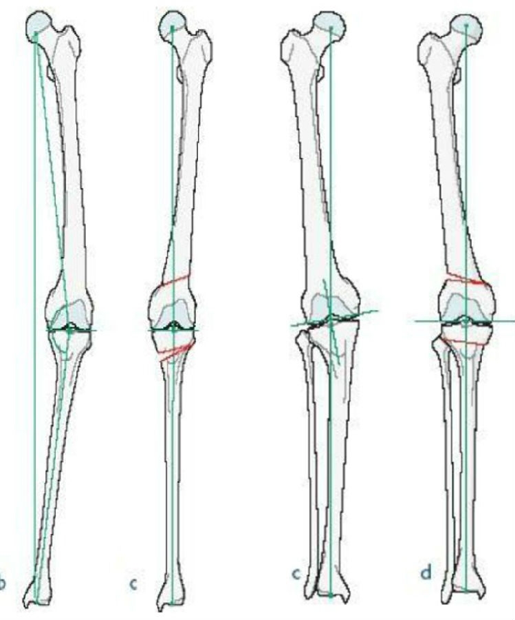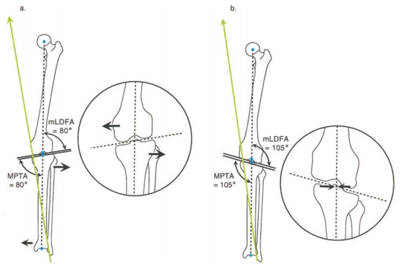 截骨矫形的整体目标是达到目标力线,并实现关节线无倾斜。有股骨畸形而单纯进行胫骨高位截骨术,会造成关节线倾斜。当出现不同方向的关节线倾斜,就会影响膝关节出现剪切力,导致患者出现不适症状。
