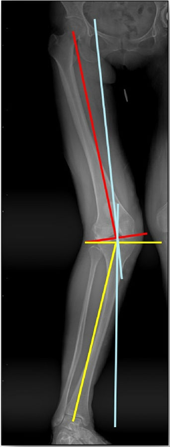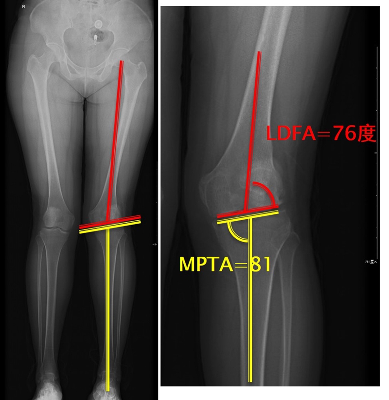 量股骨远端外侧角和胫骨近端内侧角,判断畸形在股骨、胫骨还是关节内。此患者股骨侧有畸形,LDFA=76°,MPTA=81°,无关节内畸形。
