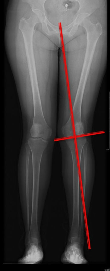 画下肢机械轴,股骨头中心链接踝关节中心判断患者为内翻畸形还是外翻畸形。此患者为外翻畸形。