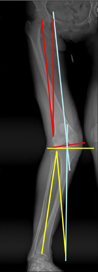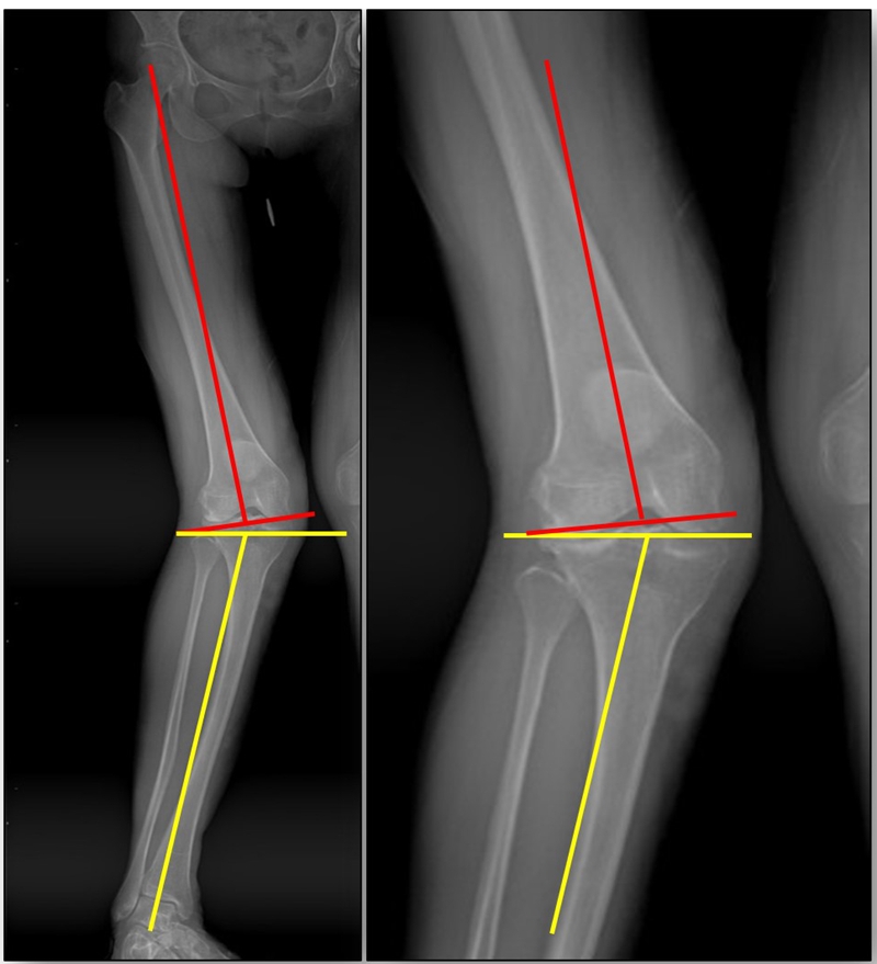 患者在整体力线上既可以表现为膝内翻,也可以表现为膝外翻。有研究表明,内翻膝股骨畸形占59%,内翻膝胫骨侧畸形占31%,内翻膝股骨+胫骨畸形占10%;外翻膝股骨畸形占22%,外翻膝胫骨畸形占45%,外翻膝股骨+胫骨畸形占33%。
