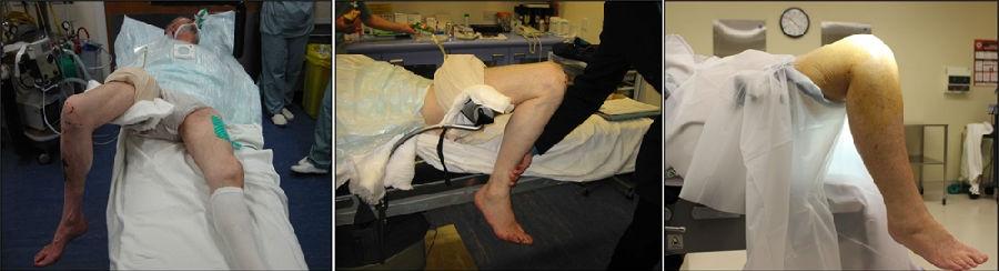 体位:腿架(Biomet)不要放在腘窝,可以放在靠近止血带的附近。病人在病床边缘,屈髋40°外展。腿自然下垂,膝屈曲110º,全膝关节可以完全屈曲。