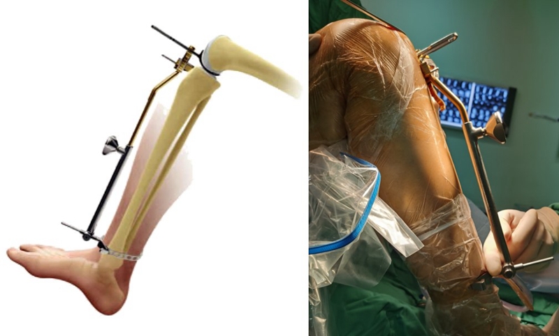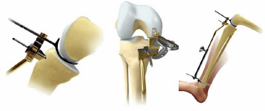 胫骨截骨方法:使用髓外定位器,系在脚踝上,平行于胫骨前脊,屈曲面/髂前上棘,越过髌骨肌腱,使用0号截骨块、3或4 G型夹,随后打钉。